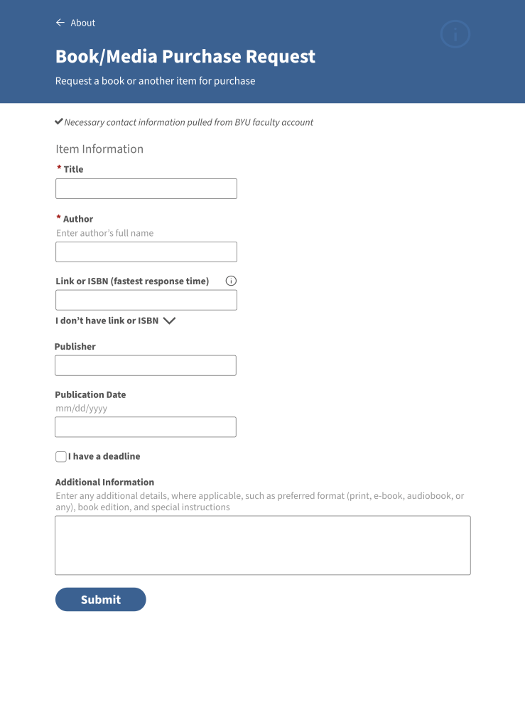 The BYU Library wanted to its feature to let patrons suggest books for the library to purchase. The existing form worked, but patrons often did not include all the information that librarians would need to find that book quickly, leading to extra time being spent trying to find the book. I was asked to redesign the form to better help both librarians and users.