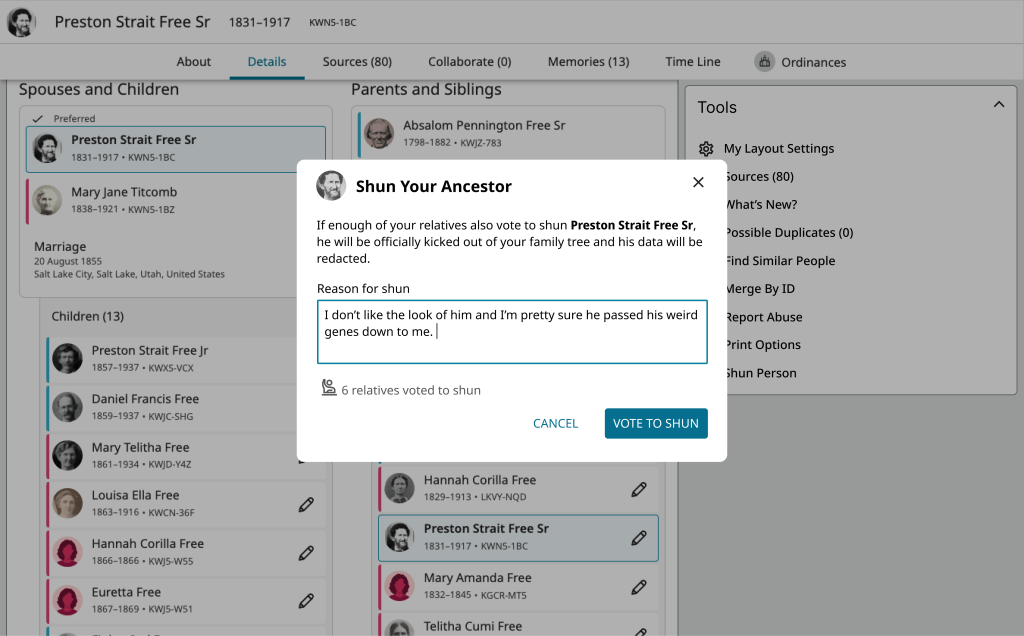 Shun an ancestor you don’t like, provided enough of your relatives also vote to shun